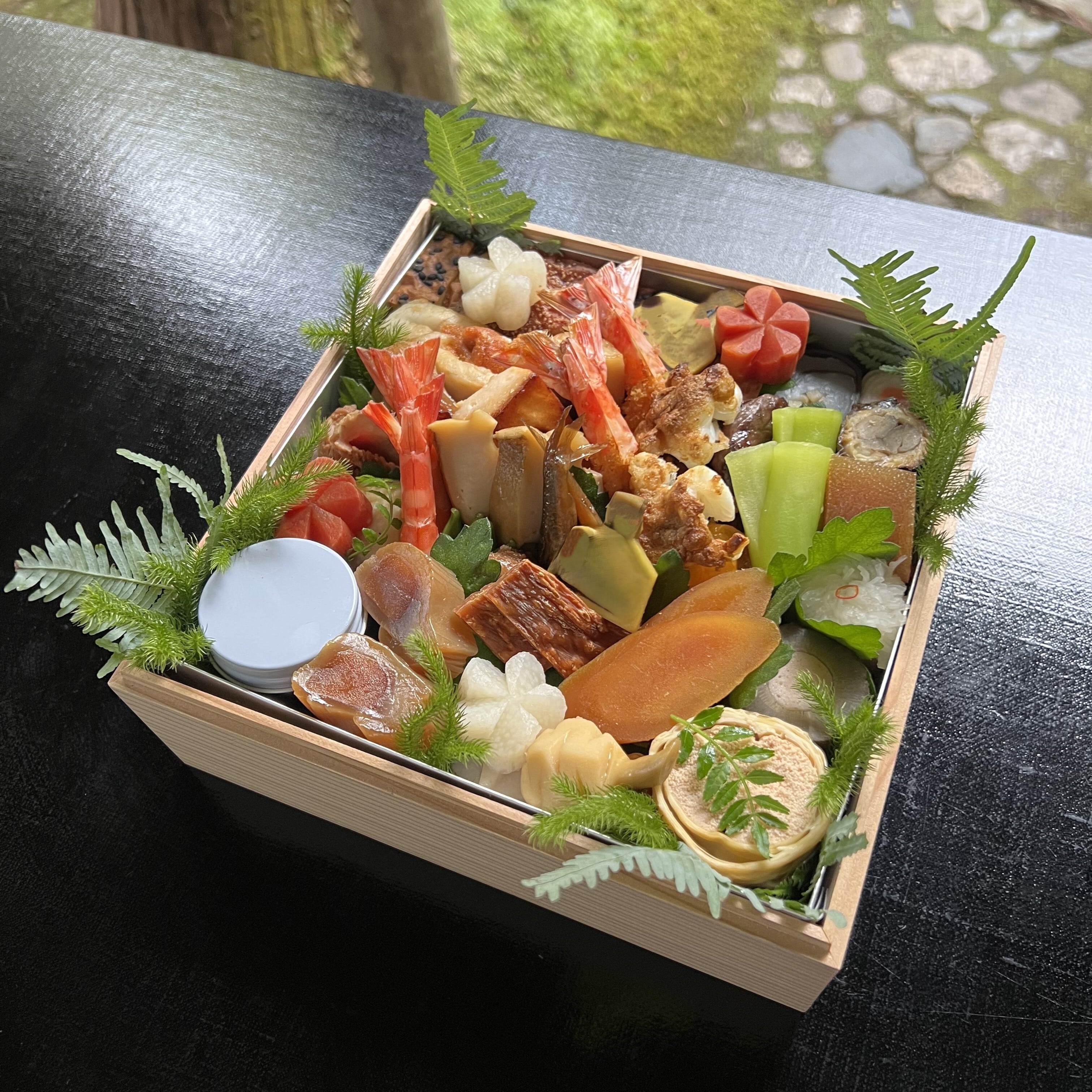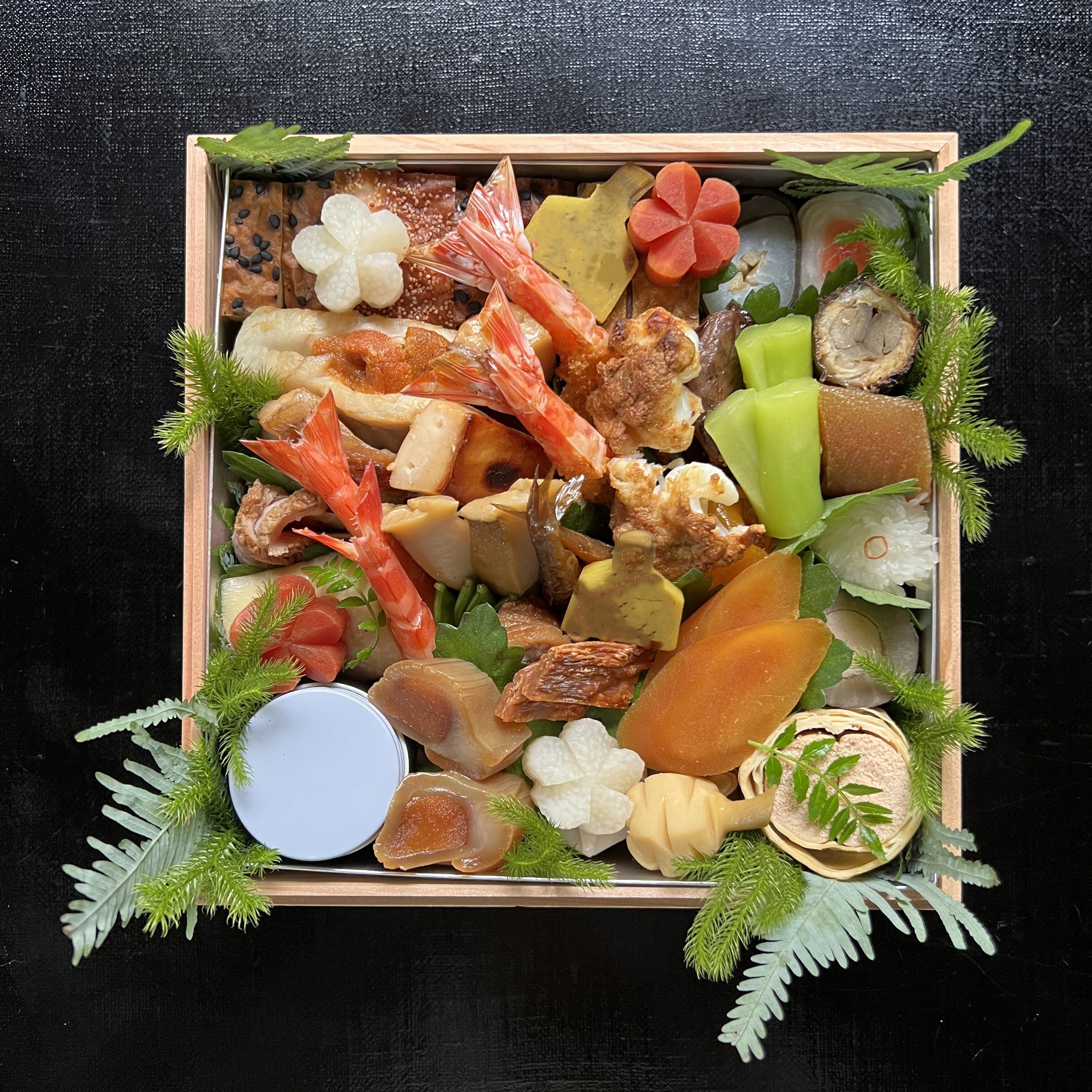 まながつお味噌幽庵焼/鰆生雲丹ばさみ/車海老カラスミ焼き/鶉味噌漬け/海老松風/帆立松風/平目龍皮巻き/数の子粕漬け/サーモン砧/カラスミ/鮑柔らか煮、チシャトウ味噌/黒豆蜜煮/網笠柚子/竹の子/松笠くわい/鶴小芋/車海老つや煮/鳴門穴子/寄せ子/絵馬くわい/炊きもろこ他